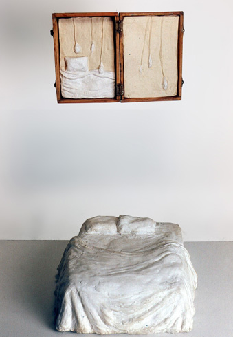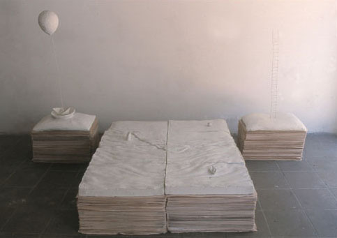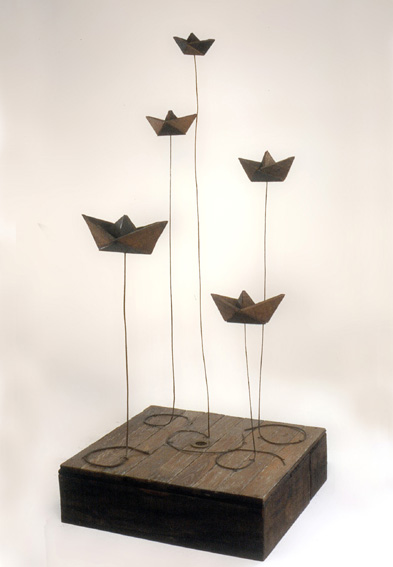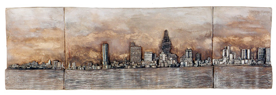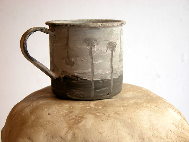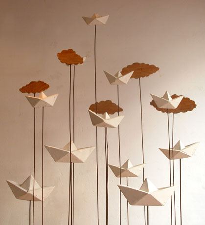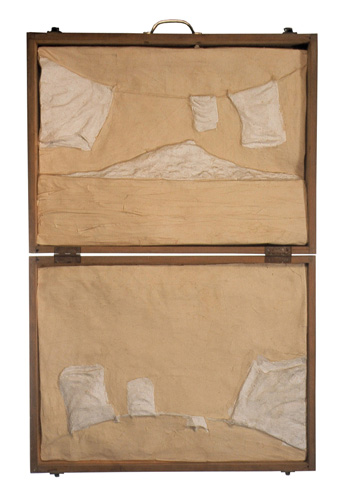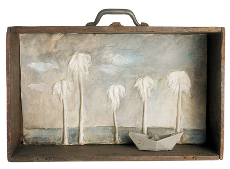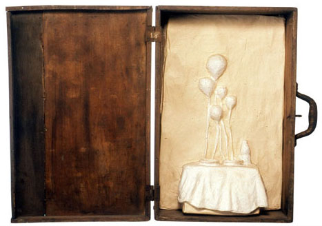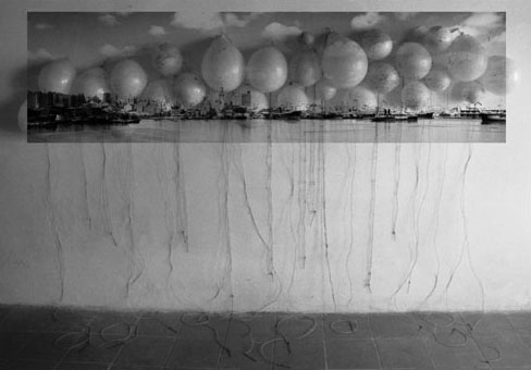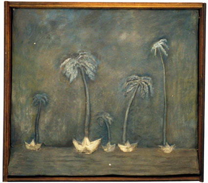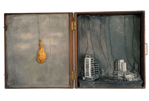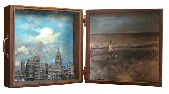 Entre tant de personnes qui s’en vont du pays, il y à ceux qui restent avec son paysage. Ils remplissent leurs valises de souvenirs, de photographies, de symboles qui font référence au contexte personnel et collectif. Image qui deviennent exactement le contraire des images q’acquièrent les touristes de passage ces anti-souvenirs évoquent une ville qui est partie ailleurs ou nulle-part. Une sensation désenchantée est le nœud qui attache touts les fils de l’exhibition de F. Arnaud . Un sentiment d’angoisse, réaffirmé par un e certaine rusticité formelle des les volumes et une palette de couleurs plomb gagne toutes les “scènes”. “Paysages” est le titre mis par l’artiste. C’est un état d’âme qui s’extériorise. La démarche artistique pour ce (desahogo ) est a la fois sculpture, peinture et scénographie: sept mallettes ouvertes comme des fenêtres, tris plats décorés à la main, un panorama de la ville réalisé en papier comme un haut-relief –qui est aussi un triptyque comme les vieux retables – et une petite installation projetée sur des ballons. Avec ce simple répertoire l’artiste explore les pulsions internes, les circonstances de nôtre Temp., mesure la distance qui existe entre l’illusion – d’un pays meilleur, un futur possible- et sa perte. L’ utilisation des mallettes constituent le meilleur support de l’exposition car ils montrent une contradiction entre la conception portable de l’équipage et la pesanteur des souvenirs Ils décrivent la sensation d’exil, la difficulté d’établir un sens d’appartenance dans l’instable des émotions. L’image fréquente des “fils” apparaît comme un symbole de fragilité dans - ces mini-theâtres- les valises ouvertes servent de scénario où représenter un drame personel qui nous indique finalement qu’est nécéssaire et qu’est qui ne ‘est pas. “Les fils” pendent de ballons plus ou moins gonflés (“paysage intime avec ballons de gonflés”) comme l’espace ou un vélo sans conducteur fait son numéro d’acrobate (“Sur le fil”) ou comme un câble qui sert à accrocher le linge dans un toît typique de Montevideo. Les fils unissent les extrémités et soutien apeinne la vie mais ils peuvent se casser d’ un moment à l’autre. Cet instant ou territoire problématique est tendu au maximum jusqu’à créer une expérience surréaliste, déconcertante comme Magritte si bien la tonalité basse fait irrémédiablement référence à nôtre habituelle « melanco_monotonie». C’est aussi «les palmiers » un emblème récurrent employé pour rappeler les paysages natifs, les paradis tropicales qui nous sont chèrs: ils sont les vestiges d’un paradis perdu à l’avance et qui se perd sur des bateaux en papiers. (« L’exil nocturne des palmiers ») une sensibilité spéciale pour créer des climats à travers l’ironie fait des perceptions d’Arnaud un important apport pour lire nôtre actuelle condition, (La diaspora) entre l’idée de pays et les gens. D’autre part le changement choisi par l’artiste du ciment au plâtre au papier, est convainquant et convincent : Il réussit à transmettre la même solidité que les anciennes œuvres mais l’artifice par les plis qui révèlent, sont évidence du vide intérieur des images, des objets, des évocations.